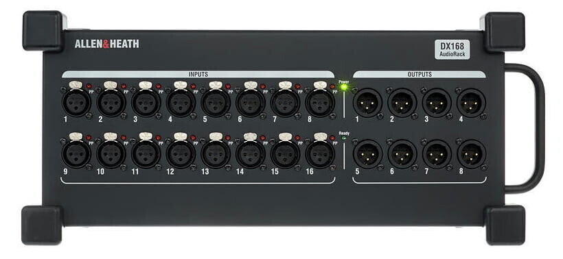 Allen & Heath dLive-DX168 - коммутационный блок для цифровой микшерной системы dLive. Блок может использоваться как системами dLive S Class, так и с системами dLive C Class. DX168 имеет 16 микрофонных XLR входов и 8 линейных XLR выходов, подключается к системе dLive по собственному протоколу Allen & Heath DX (96 кГц) при помощи кабеля CAT5e длиной до 100 м. В режиме резервирования для подключения модуля к dLive S Class можно использовать два кабеля, также возможно стандартное подключение к системам S Class и C Class при помощи одного кабеля. Кроме этого, в режиме "Каскад", который будет доступен в прошивке 1.60 к системам S Class и C Class можно подключить до шести модулей DX168, получив таким образом до 96 удаленных входов и 48 удаленных выходов.