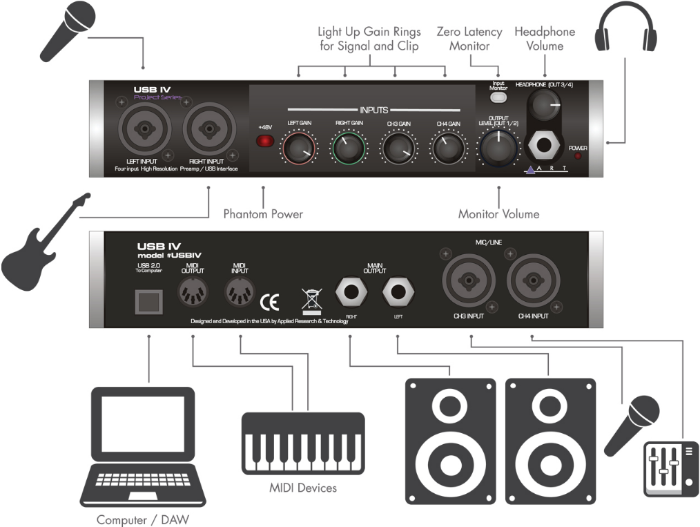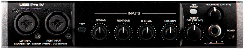 Art USB Pre IV - USB-аудиоинтерфейс с четырьмя комбинированными входами XLR-1/4”, поддерживающими сигналы микрофонного, инструментального или линейного уровня. Для работы с конденсаторными микрофонами предусмотрено фантомное питание +48 В. За высокое качество записи отвечает 32-разрядное преобразование с частотой дискретизации до 192 кГц.