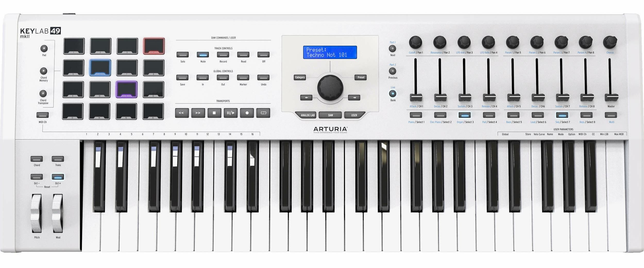 Флагманский MIDI-контроллер Arturia KeyLab MkII — это квантовый скачок с точки зрения управления, качества и экспрессии. Его отличительные особенности: 49 -клавишная клавиатура с откликом, алюминиевый корпус, продвинутый конфигурируемый интерфейс, 16 пэдов с RGB-подсветкой, 9 крупных фейдеров, 9 поворотных ручек (энкодеров), 5 входов управления экспрессией, 4 CV-выхода, интеллектуальные переключатели категорий и, конечно, MIDI- и USB-порты. В состав комплекта включено впечатляющее программное обеспечение: цифровое пианино Arturia’s complete Piano V, Analog Lab 3, and Ableton Live Lite.