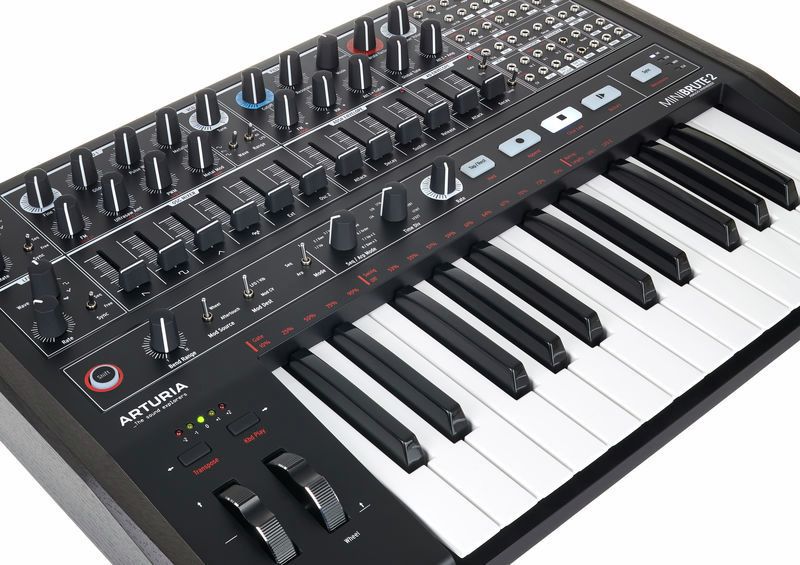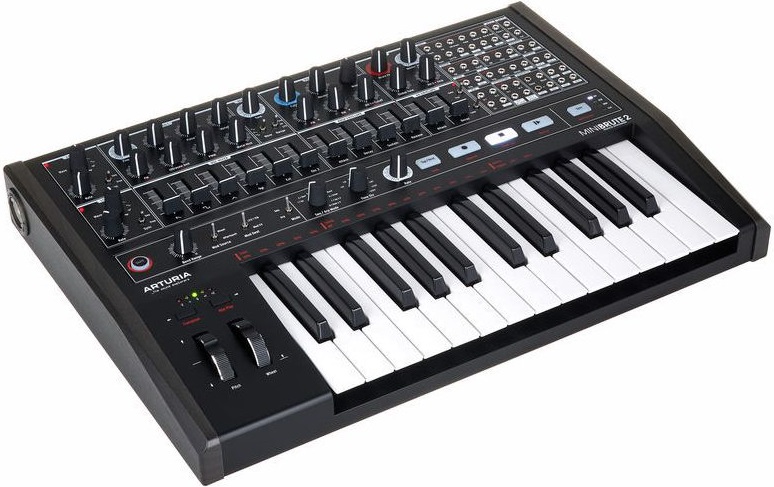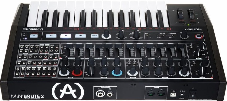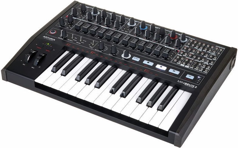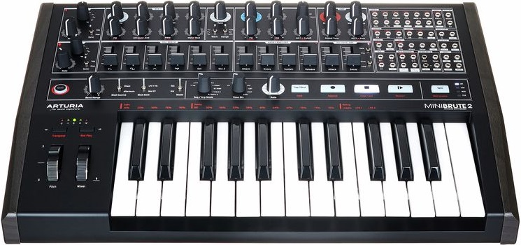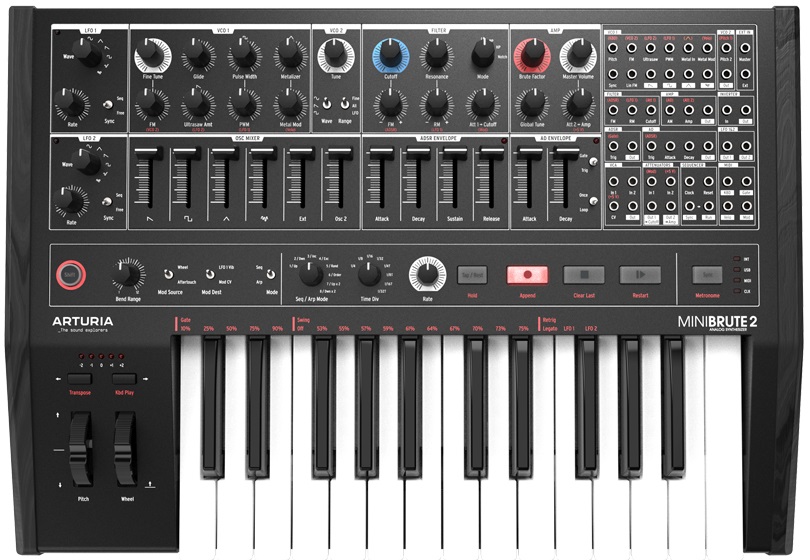 Arturia MiniBrute 2 Noir — аналоговый полумодульный монофонический синтезатор. Лимитированная серия Noir. В основе субтрактивного синтеза находятся два аналоговых осциллятора, генератор шума и внешний вход. Для формирования сигнала VCO 1 доступны пилообразная, квадратная и треугольная формы. Фильтр Штайнера-Паркера позволяет переключаться между режимами низких, полосовых, высоких частот, а также режекторным режимом. Регулируется срез и резонанс. В фильтр встроен дисторшн Brute Factor.
