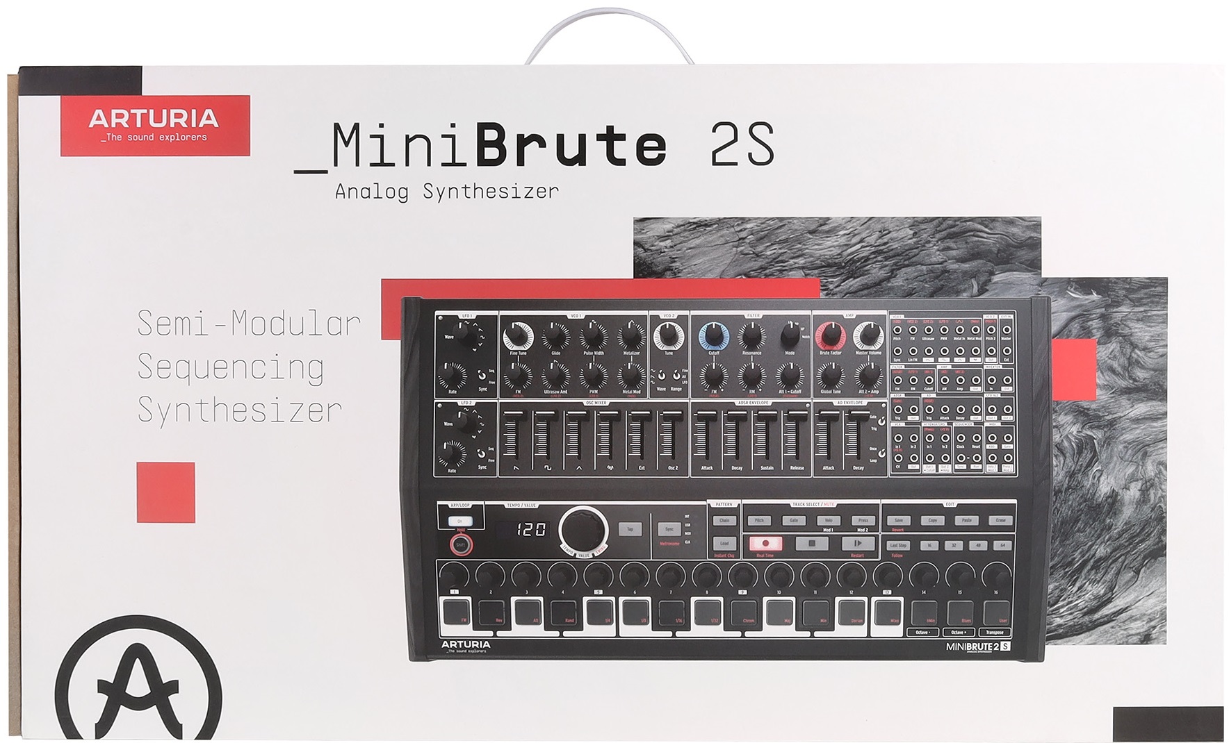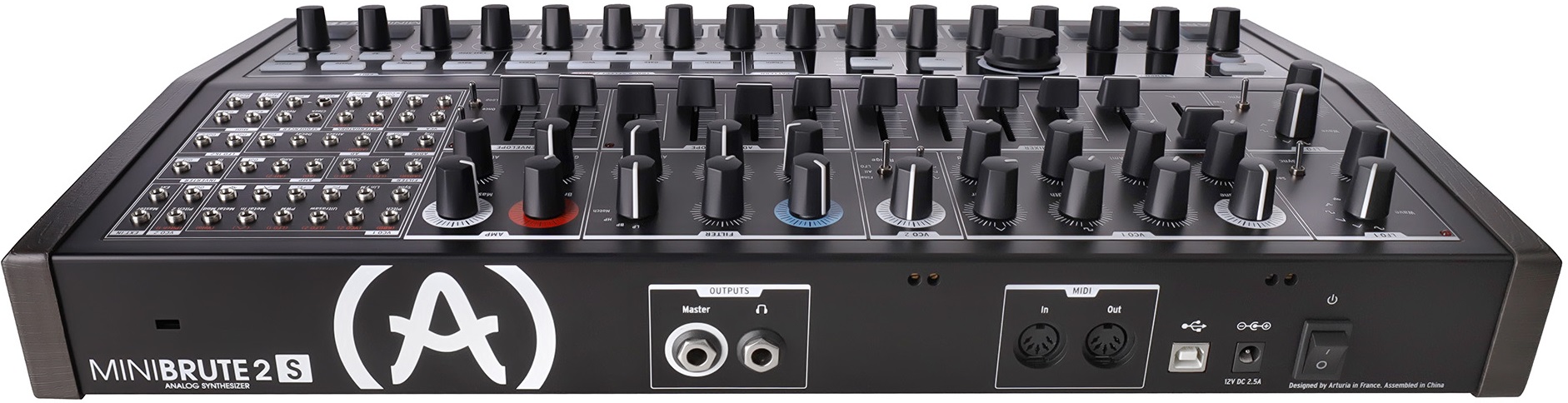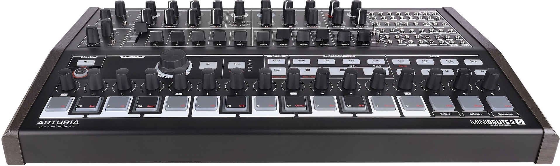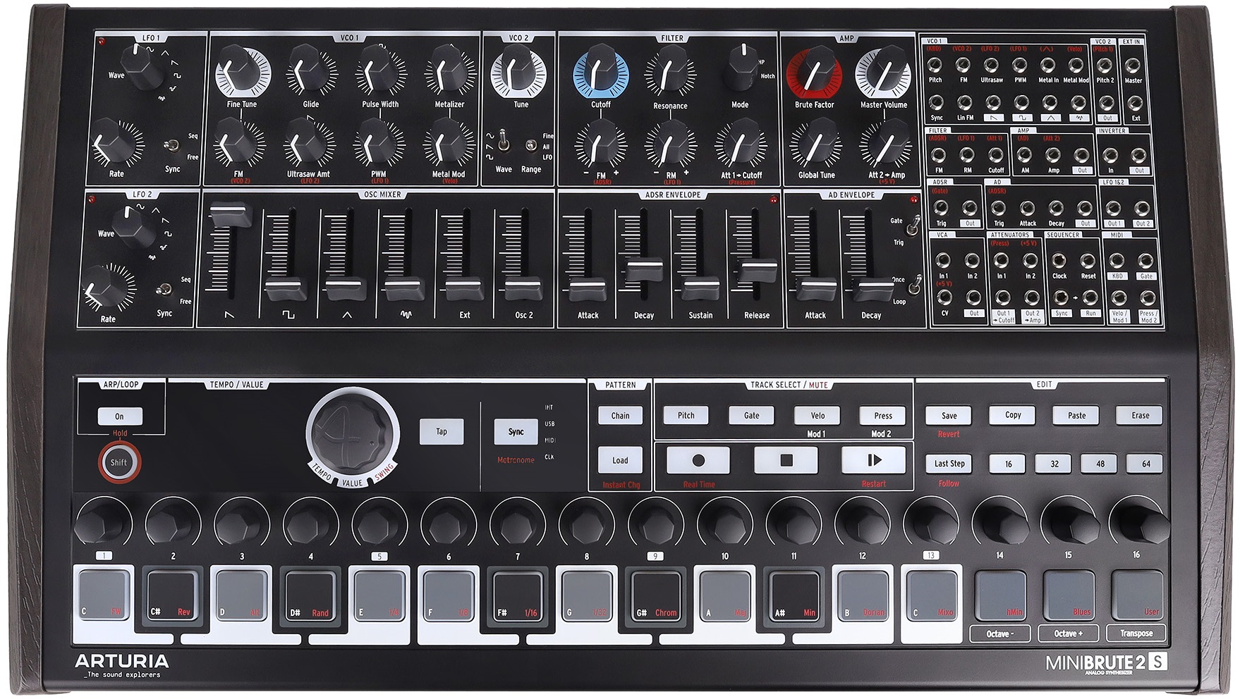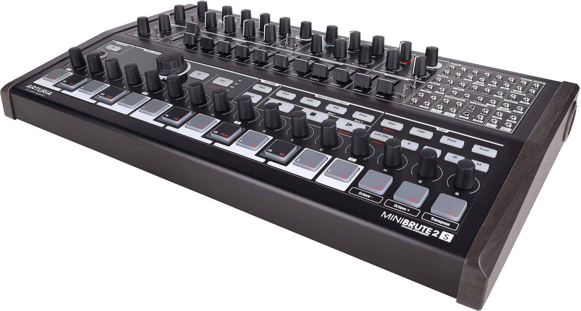 Arturia MiniBrute 2S Noir — полумодульный монофонический аналоговый синтезатор с коммутационной панелью на 48 разъемов и полной совместимостью с Eurorack. Лимитированная серия Noir. Оснащен 16 пэдами, чувствительными к velocity, и 64-шаговый секвенсором. Звук генерируется двумя осцилляторами. VCO 1 позволяет микшировать сигналы пилообразной, квадратной и треугольной форм, а также белый шум и внешний аудиовход. VCO 2 работает с синусоидальной, пилообразной и прямоугольной волнами.