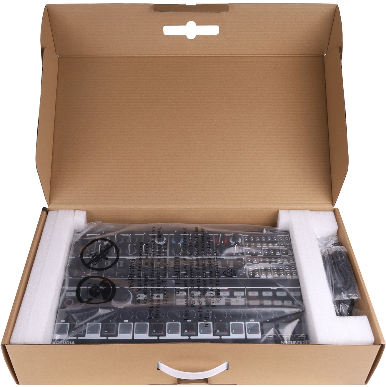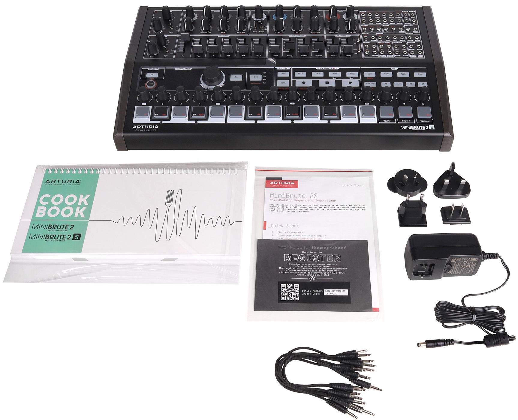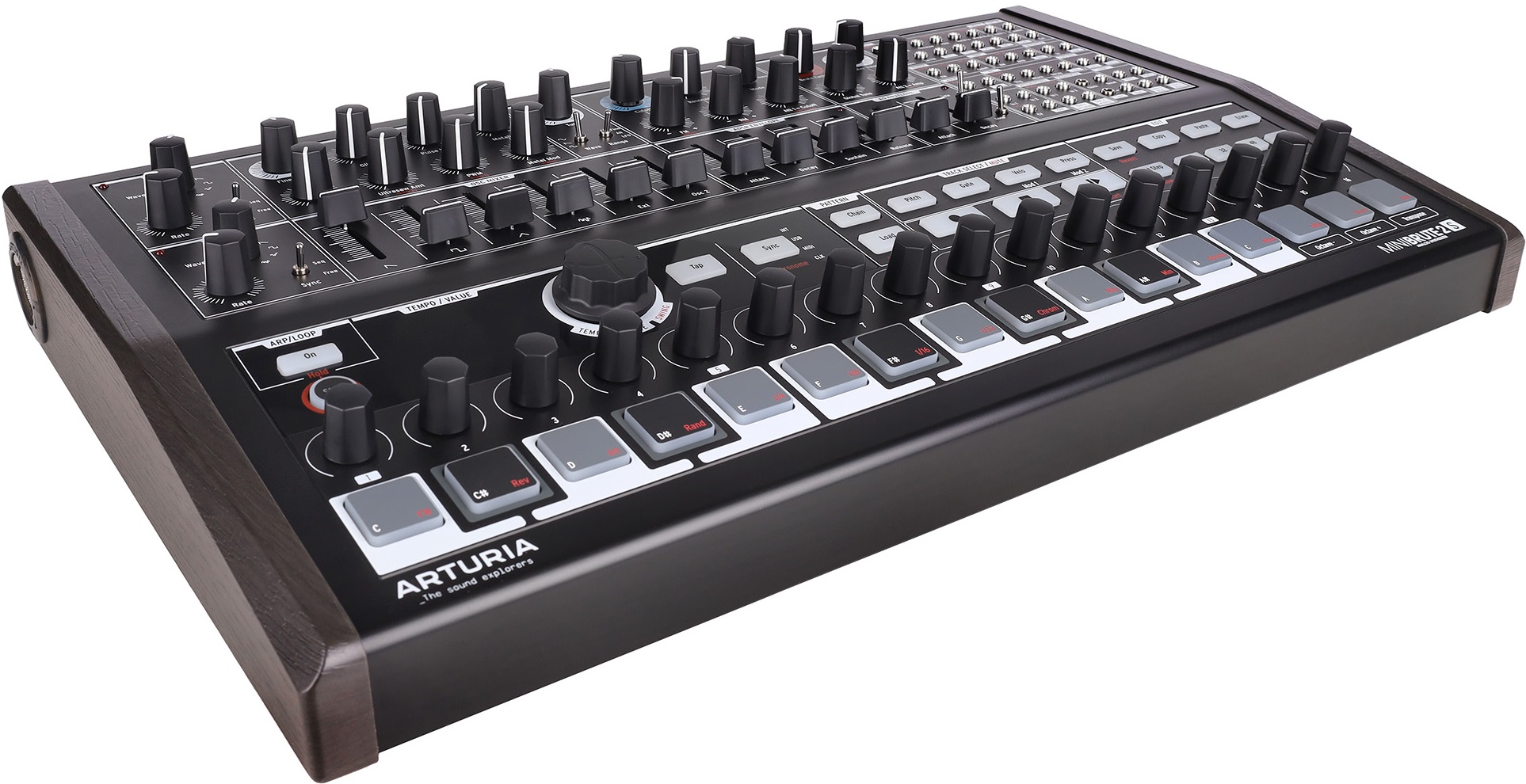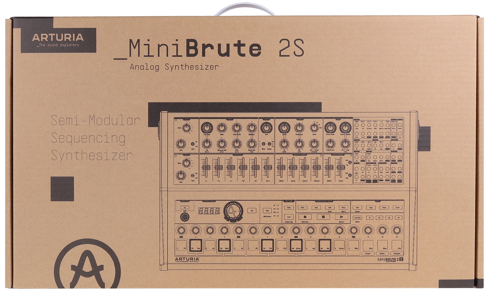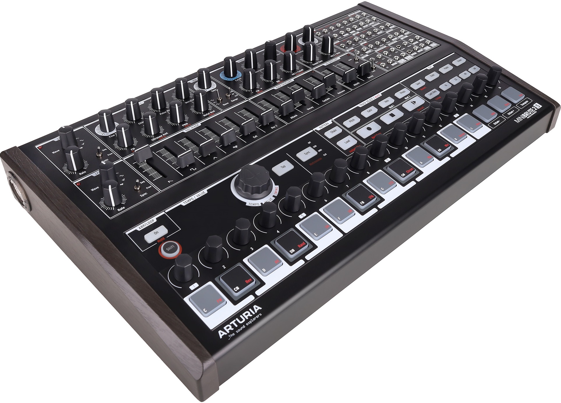 Arturia MiniBrute 2S Noir — полумодульный монофонический аналоговый синтезатор с коммутационной панелью на 48 разъемов и полной совместимостью с Eurorack. Лимитированная серия Noir. Оснащен 16 пэдами, чувствительными к velocity, и 64-шаговый секвенсором. Звук генерируется двумя осцилляторами. VCO 1 позволяет микшировать сигналы пилообразной, квадратной и треугольной форм, а также белый шум и внешний аудиовход. VCO 2 работает с синусоидальной, пилообразной и прямоугольной волнами.