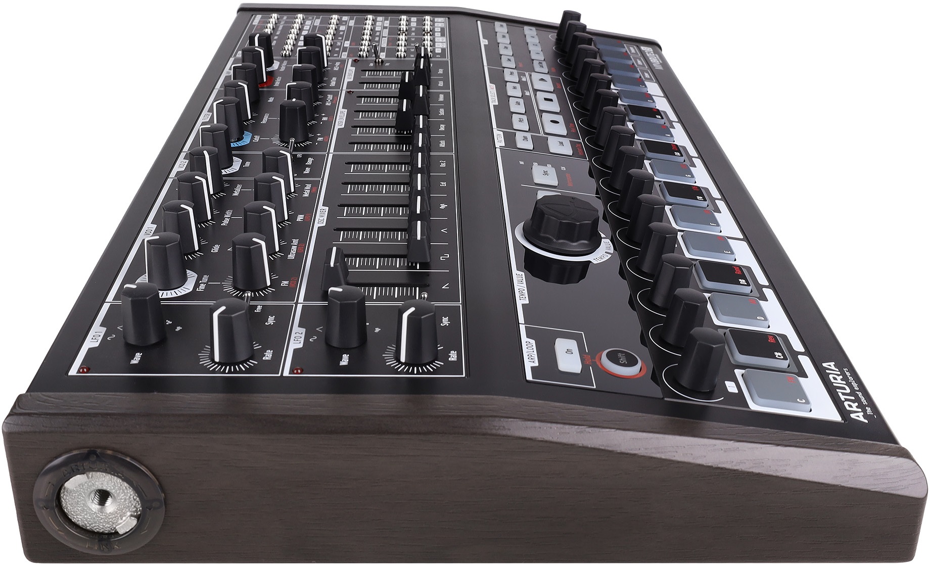 64-шаговый секвенсор оснащен 64 ячейками памяти и тремя параллельными уровнями работы. Секвенсор 1 управляет высотой тона, гейтом, темпом и давлением, секвенсоры 2 и 3 могут управлять гейтом, высотой, CV, LFO и огибающими. Доступно редактирование в режиме реального времени и пошаговое редактирование. Коммутационная патч-панель на 48 разъемов позволяет перенастраивать внутреннюю архитектуру инструмента, а также взаимодействовать с модулями Eurorack. Прочный алюминиевый корпус с деревянными стенками придает винтажный внешний вид и совместим с системой RackBrute высотой 3 или 6 U.