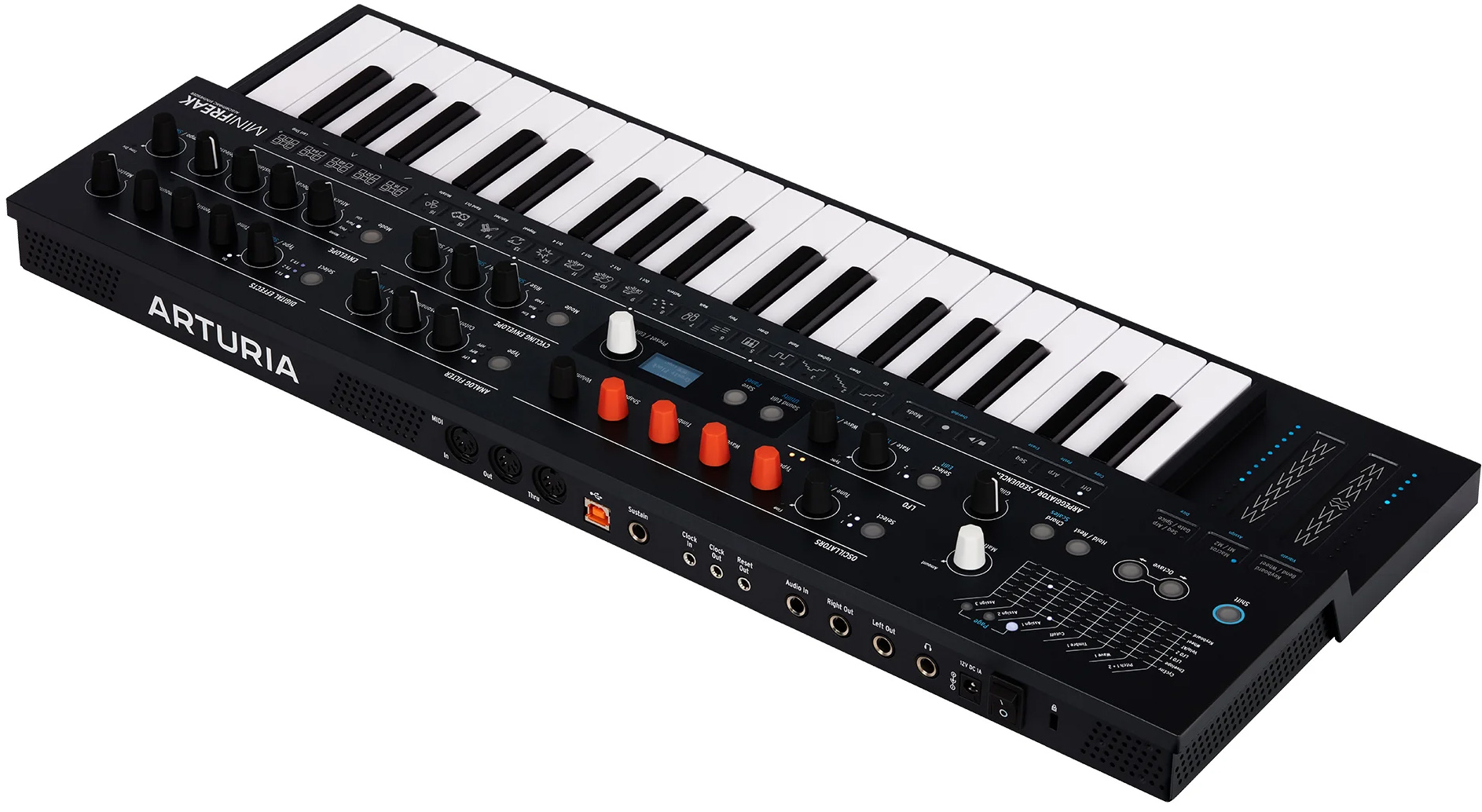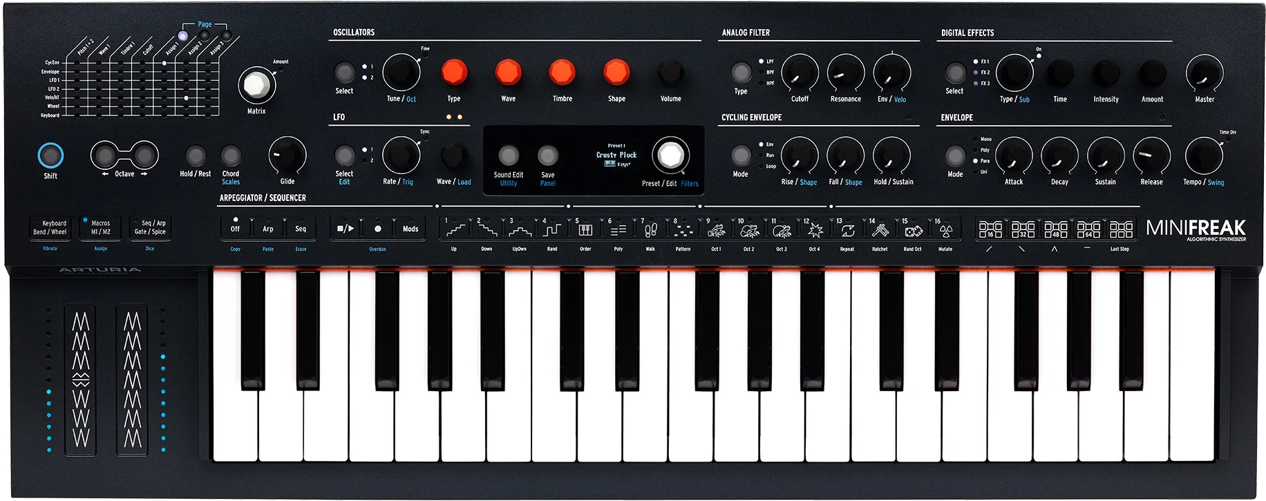 Arturia MiniFreak - гибридный 37-клавишный спонтанный алгоритмический синтезатор. Модель оснащена двумя цифровыми звуковыми движками, аналоговыми фильтрами, матрицей модуляции и разнообразными стереоэффектами. Звуковые движки предлагают более 20 режимов, которые можно задействовать по отдельности, накладывать друг на друга и обработать их звучание на выходе для создания уникальных звуковых текстур.