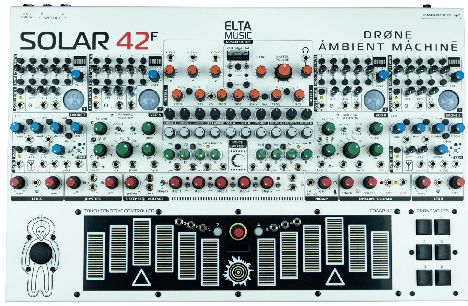 Elta Music Solar 42F - дрон синтезатор преемник широко известной модели Solar 50 и, таким образом, представляет нынешний премьерный класс дроновых синтезаторов. Благодаря восьми голосам и осцилляторам Solar 42F сочетает в себе три различных подхода к генерации звука и объединяет их для создания законченного произведения. Стереофонический сигнальный тракт содержит два фильтра Polivoks, которые можно использовать для управления обертонами невероятно плотного микса осцилляторов, а также модулируемый процессор эффектов, работающий с картриджами. Сенсорный контроллер является центральным элементом для воспроизведения нот. Кроме того, есть несколько источников модуляции, таких как джойстик CV или 5-шаговый секвенсор. В целом, Solar 42F является чрезвычайно универсальным и интересным кандидатом для озвучивания современных научно-фантастических фильмов, создания мрачной атмосферы для видеоигр, музыкальной передачи утреннего тумана за первым кофе в консерватории и для всего, что предполагает постоянное взаимодействие между музыкантом и инструментом в контексте электронной музыки.
