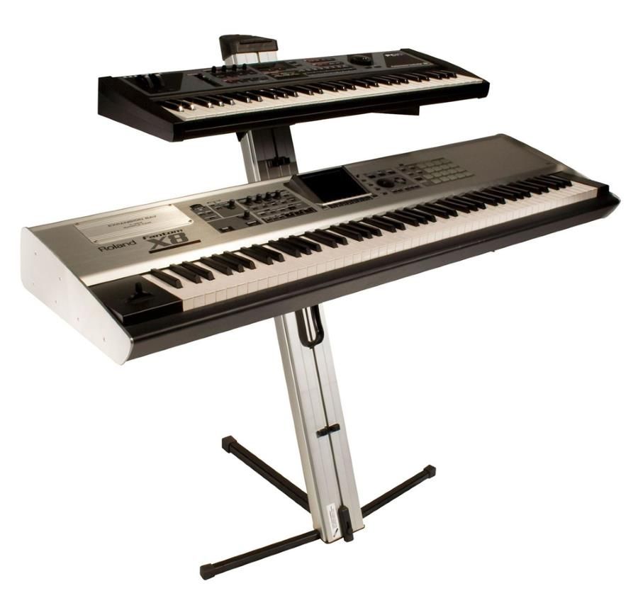 Клавиатурная стойка для двух инструментов. C ножками, обеспечивающими великолепную устойчивость даже при использованиии очень больших клавишных. Легко устанавливается. Очень компактна в сложенном виде. Максимально допустимая нагрузка — 56.8 кг на ярус.