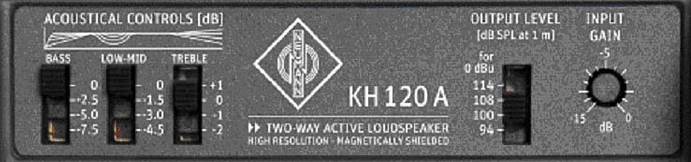 Студийный монитор Neumann KH 120 A предназначен для использования в ближнем поле или в качестве заднего громкоговорителя в больших многоканальных системах. Neumann KH 120 A представляет собой новейшую акустическую и электронную технологию моделирования для обеспечения максимально точного воспроизведения звука. У него есть Математически Моделированный Дисперсионный волновод (MMD (TM), гибкие элементы управления акустикой, аналоговые усилители класса A/B, большой запас уровня аналогового входа и обширный монтажный аппаратный диапазон. Всё это обеспечивает пользователю максимальную универсальность в широком диапазоне акустических условий, исходном оборудовании и физическом месте.