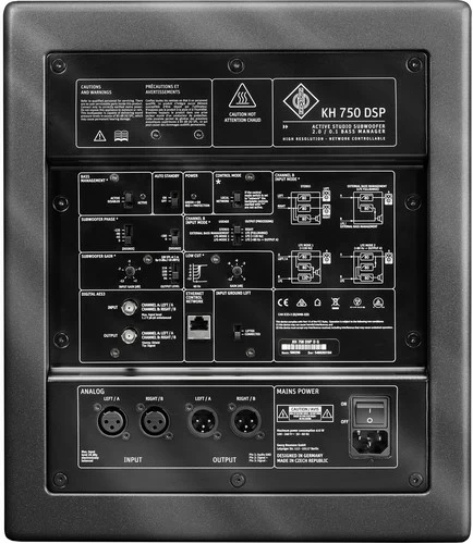 Neumann KH 750 DSP – компактный активный сабвуфер с очень глубоким басовым откликом. DSP движок оптимизирует выходной сигнал для достижения звука референсного качества. Кабинет оснащен уникальной и гибкой функцией бас-менеджмента – 2.0/0.1 Bass Management, позволяющей использовать сабвуфер в различных конфигурациях. На задней панели расположены аналоговые (балансные XLR) и цифровые (для сигналов AES3 и S/P-DIF,192 кГц/24-бит) входы и выходы, переключатель режимов маршрутизации и различные контроллеры акустических параметров, включая регулятор входного гейна, переключатель выходного уровня, переключатель фазы и регулятор НЧ фильтра.