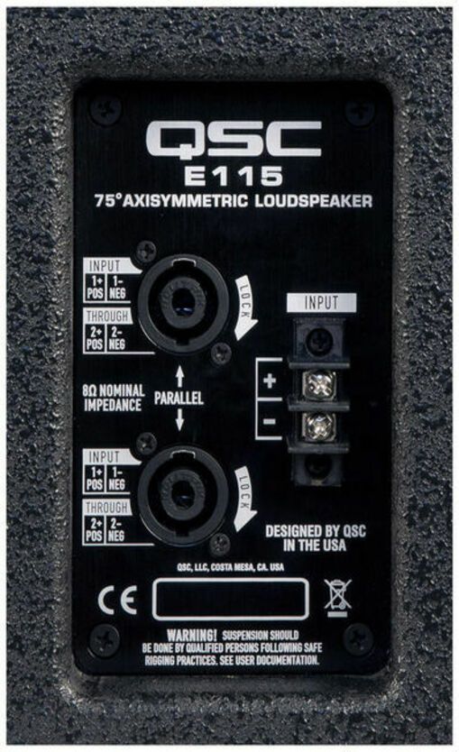 Акустическая система QSC E115 выполнена в трапециевидном корпусе из фанеры с черным покрытием, которое уберегает корпус от повреждений, царапин и вмятин во время туровых перевозок. Также для удобства переноски на корпусе располагаются 2 ручки. Динамики защищены стальной перфорированной решеткой. Для навесного монтажа присутствуют 9 точек для рым-болтов диаметром M10, таким образом, модель можно подвешивать или устанавливать вертикально, получая одинаково превосходное качество звука. Акустическая система прекрасно справится с озвучиванием больших концертных залов, может с успехом использоваться на вечеринках в клубах, а также в караоке-барах, воспроизводя музыку мощно, громко и натурально.