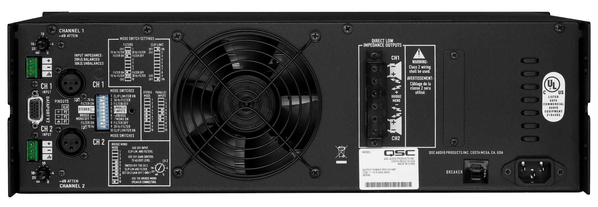 Передняя панель QSC ISA450 даёт доступ к тумблеру питания, а также светодиодам состояния и превышения уровня. Там же находятся и воздухозаборники: воздух для лучшего охлаждения прогоняется сквозь корпус и выводится наружу с помощью вентилятора на тыловой части. Биполярная выходная схема уменьшает на 40% энергопотребление и генерацию тепла. Фильтры нижних частот (30 Гц или 70 Гц) защищают АС и предотвращают насыщение трансформаторов громкоговорителей с минимальным воздействием на программный материал. Все основные органы регулировки (лимитеры, НЧ-фильтры и т.д.) представлены в виде DIP-переключателей и расположены на тыловой панели, там же можно найти балансные входные разъемы XLR, колодки Euroblock 3-pin и колодку выходных клемм, и, наконец, выходной коннектор HD15 DATAPORT. Рядом со входами расположены небольшие ручки аттенюатора. Большой вентилятор обеспечивает автоматическую регулировку числа оборотов в зависимости от температуры.