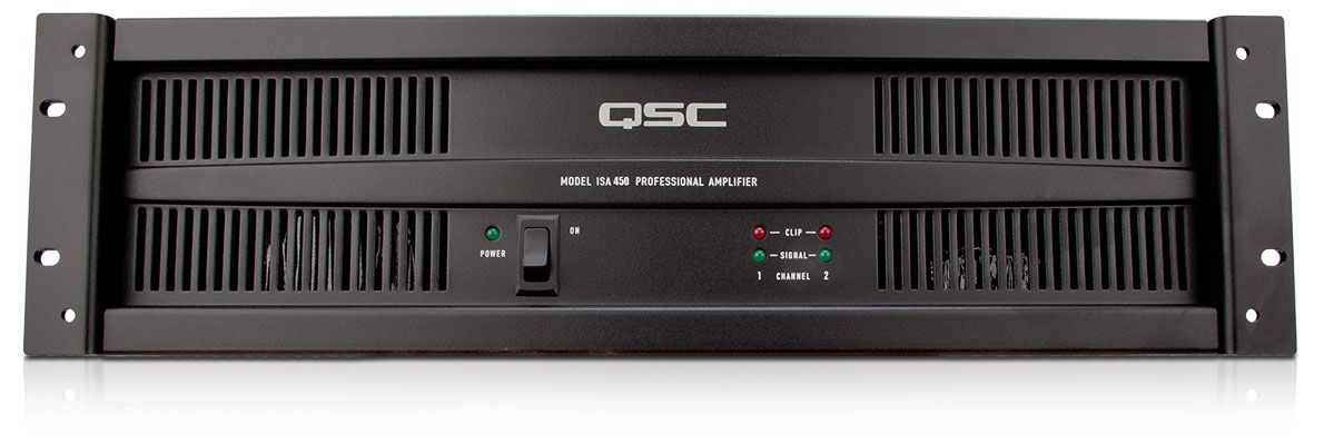 QSC ISA450 – двухканальный коммерческий рэковый усилитель мощности класса AB серии ISA (высота – 3U). Он обеспечивает высокий выходной уровень звука для профессиональных АС и может быть использован для озвучивания больших помещений, а также в постоянных и временных инсталляциях. Три схемы работы – мостовая, монофоническая и стереофоническая. Полная выходная мощность в зависимости от нагрузки составляет 260 Вт/канал при подключении акустики сопротивлением 8 Ом, 425 Вт/канал – с четырехомной акустикой, 700 Ватт/канал – с двухомной, также есть возможность работы в мостовом режиме: нагрузка 4 Ома обеспечит в итоге 1400 Ватт. Интегрированы – в числе прочего – независимые отключаемые лимитеры.