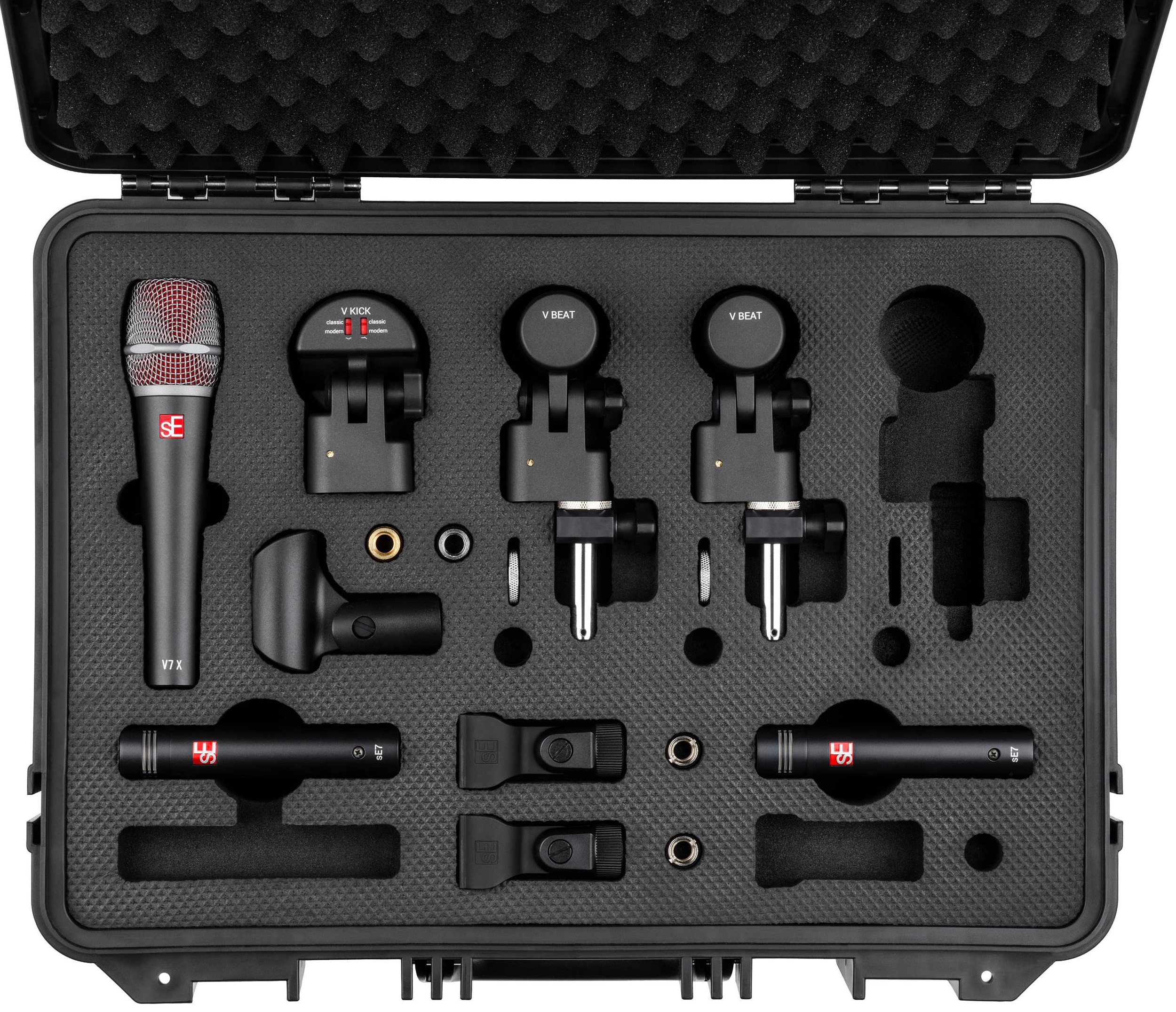 V Pack Club состоит из одного микрофона V Kick, двух микрофонов V Beat, двумя креплениями V Clamp, парой микрофонов sE7 и одного микрофона V7 X. Все микрофоны и входящие в комплект аксессуары надежно упакованы внутри прочного пластикового флайт кейса, в котором предусмотрено пустое пространство для вашего любимого хай-хэт микрофона.