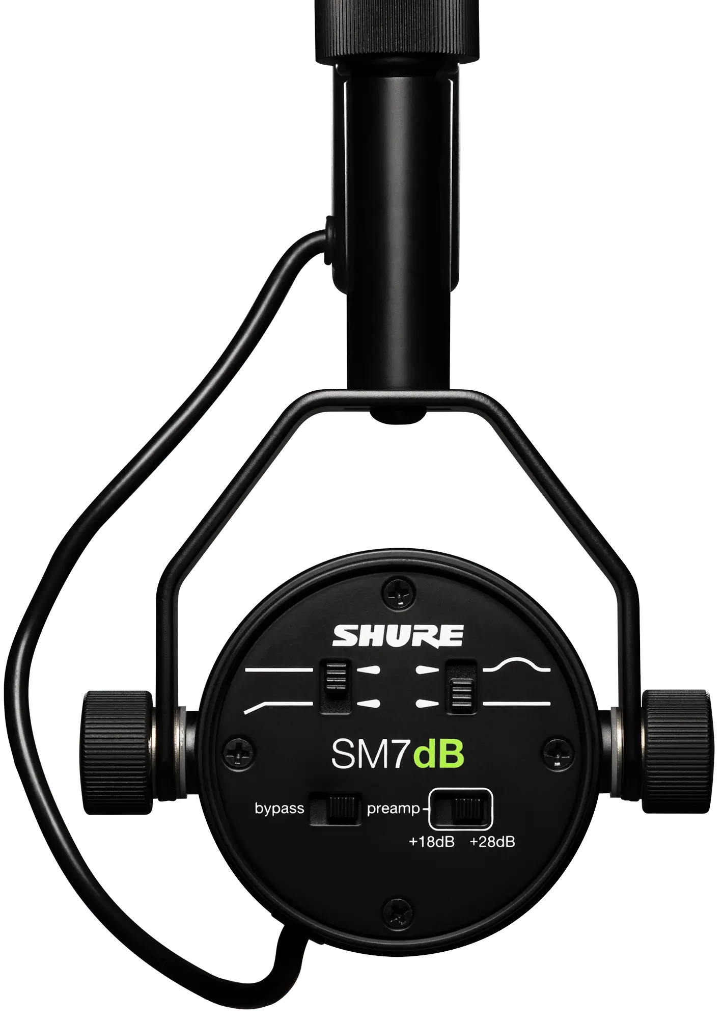 В SM 7 dB встроен усилитель, разработанный специалистами компании Shure именно для этой модели. Его выход совместим со всеми интерфейсами XLR, питание он получает фантомно +48 В. Данный предусилитель настраивается в трех вариантах: на +18 дБ, +28 дБ или же с отключением от схемы посредством тумблера True Bypass.