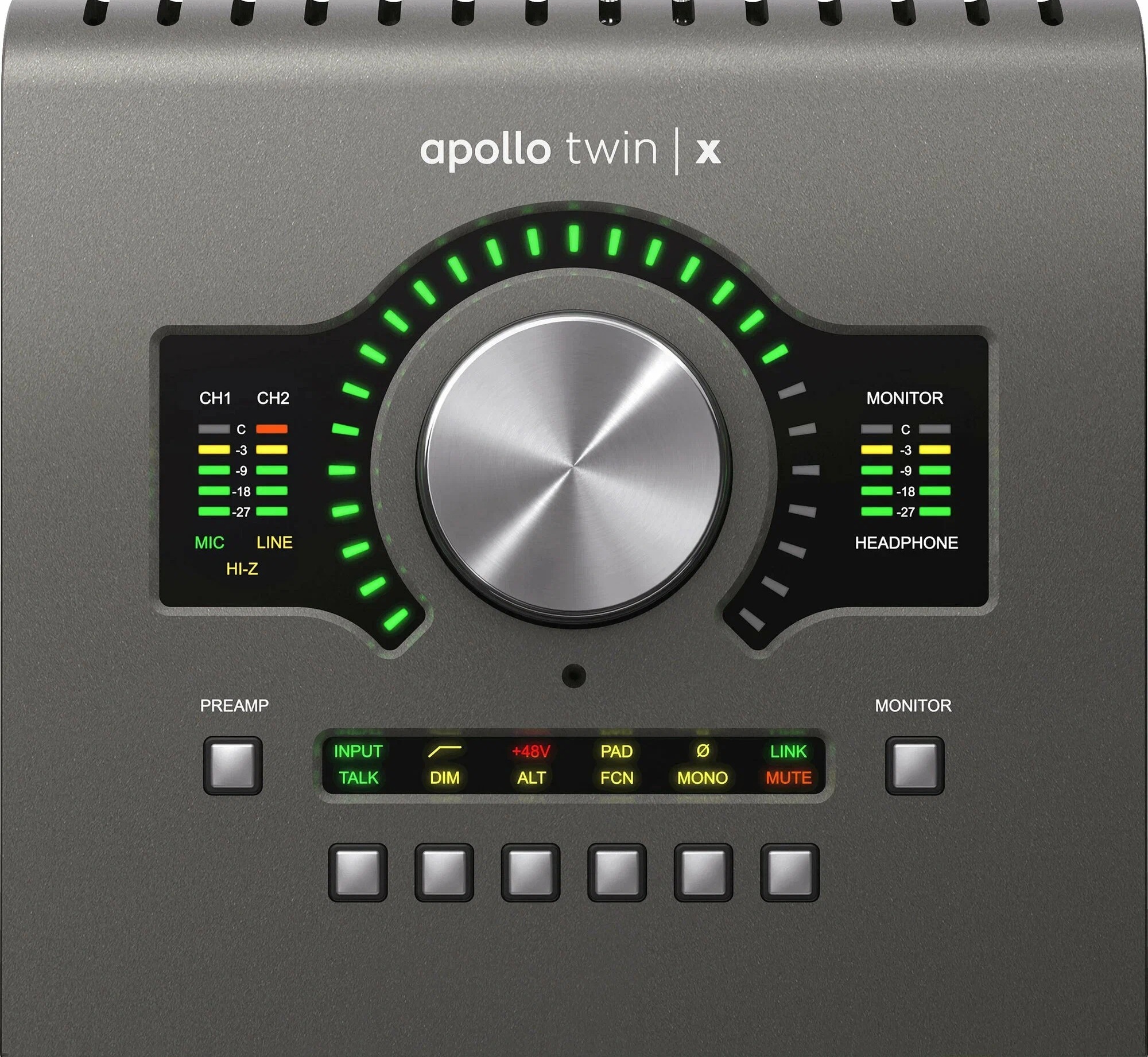 Встроенный процессор UAD-2 DUO Core позволяет работать с фирменными плагинами Heritage Edition практически с нулевой задержкой. А запатентованная технология Unison обеспечивает звучание классических ламповых и трансформаторных предусилителей от Neve, API, Manley, Avalon и других гитарных усилителей и стомпбоксов. Apollo Twin X USB Heritage оснащен двумя комбинированными микрофонными/линейными входами XLR-1/4” с поддержкой Unison, отдельным входом 1/4” Hi-Z на передней панели для прямого подключения гитары или баса. Мониторный стереовыход имеет разъемы 2 x 1/4”, а выход для наушников 1/4” TRS, каждый с индивидуальной регулировкой уровня. Два дополнительных линейных выхода 1/4” можно использовать для альтернативных выходов мониторов.