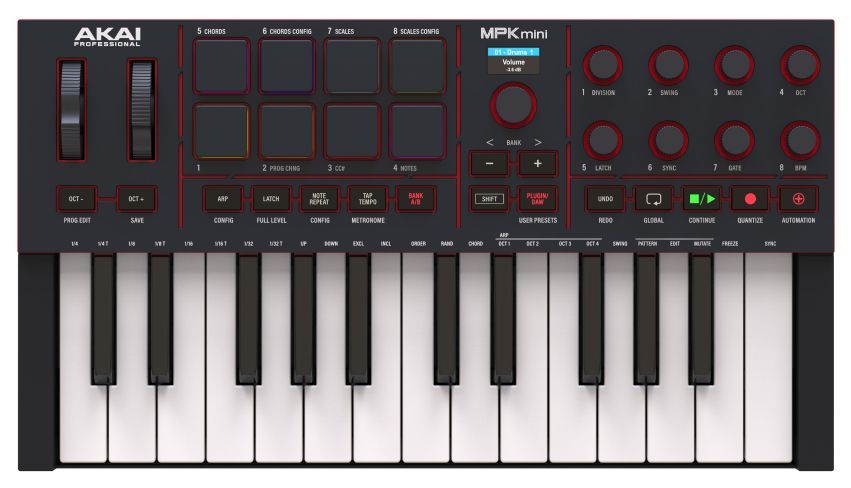 AKAI MPK Mini MK4 Black — MIDI-клавиатура на 25 клавиш. Оборудована восемью пэдами с RGB-подсветкой и чувствительностью к velocity, выделеным цветным дисплеем и транспортной панелью для навигации по проекту. Встроенный софт Studio Instrument Collection включает более 1000 звуков от AIR, Akai Pro и Moog. Подключение через USB-C не требует дополнительных адаптеров. Предусмотрены MIDI-выход и TS-разъем для педали сустейна.