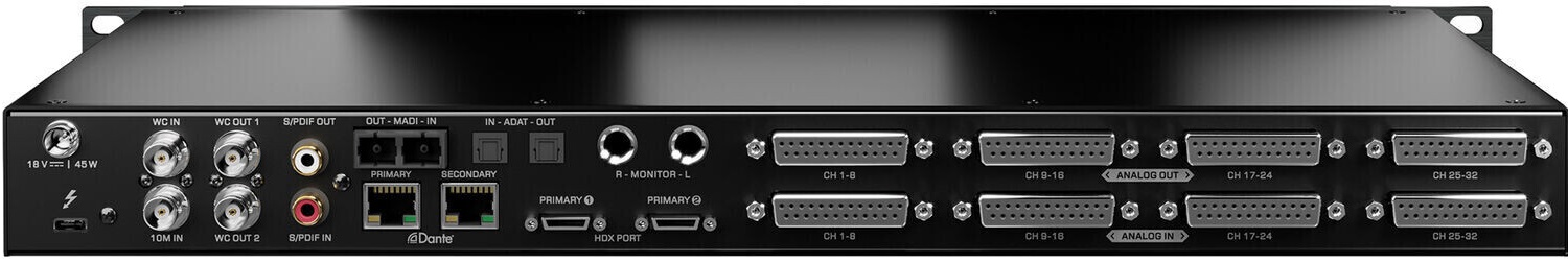 Поддерживаются Thunderbolt 3, Dante, S/PDIF, HDX, MADI и ADAT I/O, что делает Antelope Audio Galaxy 32 Synergy Core чрезвычайно мощным активом в системах аудиопроизводства любого масштаба.