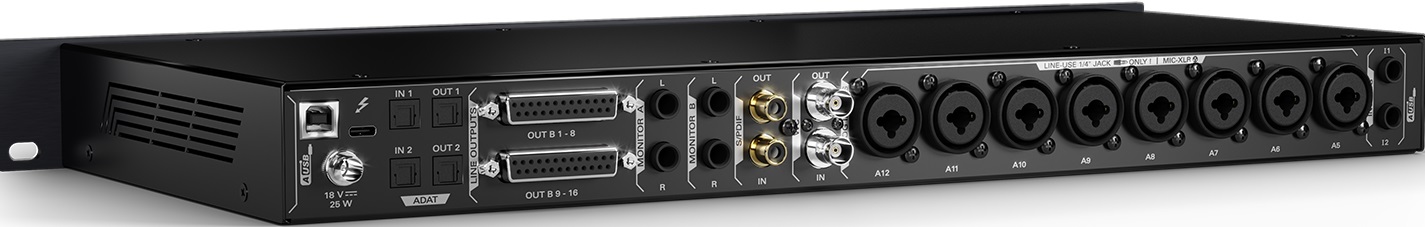 Для коммутации имеются 2 выхода для наушников, 12 XLR/TRS входов, 2 выхода и входа ReAmp, Word Clock In/Out, вход и выход S/PDIF, 4 TRS выхода, 16 линейных выходов на двух разъемах DB25, 2 ADAT In/Out, USB и Thunderbolt. Интерфейс поставляется с библиотекой из 50 плагинов-эмуляций, моделирующих популярные классические приборы, каждый из которых будет возможно задействовать в режиме минимальной звуковой задержки сигнала.