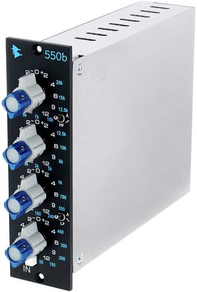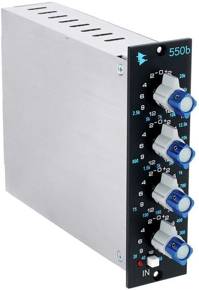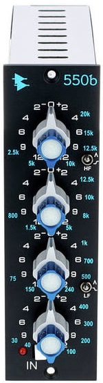 APi Audio 550b — четырехполосный эквалайзер в формате серии 500, основанный на оригинальной схеме API 550 конца 60-х годов. Каждая полоса имеет семь переключаемых частот фильтра и возможность усиления/ослабления +/- 12 дБ с шагом 2 дБ. Инновационная технология Proportional Q варьирует ширину полосы пропускания фильтра. Такая технология сводит к минимуму фазовые сдвиги.