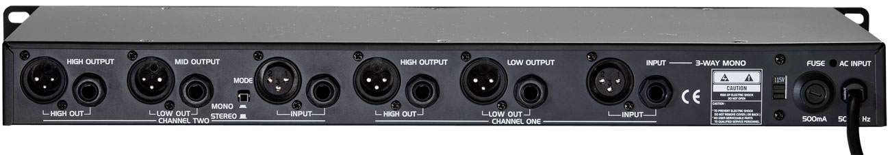 Частота разделения устанавливается в диапазонах 80 - 920 Гц и 800 - 9200 Гц. Для каждого выходного канала предусмотрена кнопка отключения. На задней панели расположены симметричные разъемы XLR и 1/4"TRS "джеки", переключатель 2-х или 3-х - полосного режима работы. Блок питания размещен внутри корпуса.