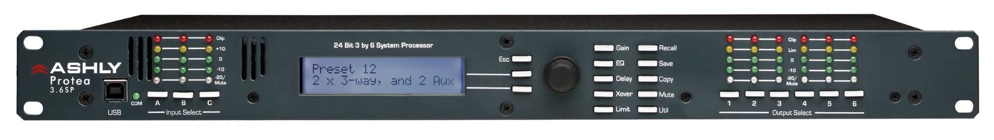 Ashly 3.6SP - цифровой спикерный процессор системы Protea с 3 XLR входами и 6 XLR выходами. Элементы управления на передней панели устройства позволяют моментально получить доступ ко всем настройкам в динамичной обстановке живых выступлений, а USB подключение на передней и задней панелях, дают возможность использовать ПО Protea для программирования процессора, что делает его отлично подходящим для инсталляций. Большие возможности DSP обработки сигнала, превосходное профессиональное качество звучания и гибкость управления позволяют использовать процессор в турах, ночных клубах, больших театральных системах и т.д.