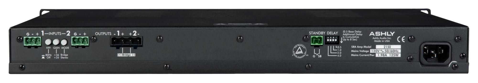 Выходная мощность Ashly SRA-2150 варьируется в зависимости от сопротивления подключаемой нагрузки (акустических систем). Минимальная мощность RMS предлагается на уровне 80 Вт/канал @ 8 Ом и 150 Вт/канал @ 4 Ом при обоих работающих каналах. При переключении в монофонический мостовой режим усилитель выдаёт как минимум 300 Вт RMS при нагрузке 8 Ом. У него балансные входные и выходные разъемы типа Phoenix Euroblock и разъем для наушников 1/4" Jack TRS на передней панели, а также ВЧ-фильтр 80 Гц. Кроме того, у усилителя Ashly SRA-2150 есть переключатель коэффициента усиления по напряжению 26/36 дБ. Можно активировать функцию задержки до 8 секунд.