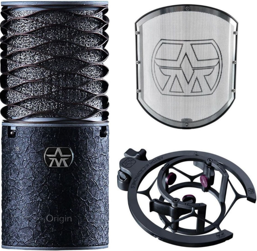 Aston Microphones Origin Black Bundle - лимитированная версия студийного конденсаторного микрофона Origin в черном цвете, включающая поп-фильтр Aston Swiftshield и набор креплений для установки на стойку.