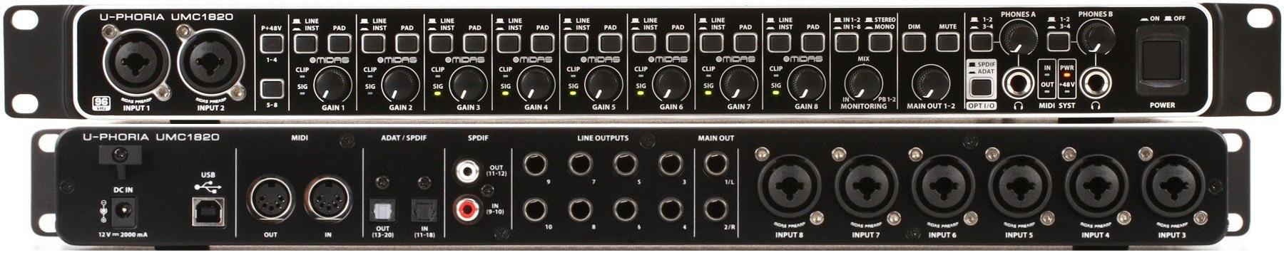 Behringer U-PHORIA UMC1820 обеспечивает пользователя 18 входами и 20 выходами, а также MIDI I/O, чего более чем достаточно для подключения и синхронизации синтезаторов, модулей, компрессоров, внешних микрофонных предусилителей, да и вообще, всего, что может понадобиться. Выходы TRS, RCA и XLR покрывает самые различные варианты подключения. С поддержкой цифровых форматов S/PDIF, ADAT и S/MUX, U-PHORIA UMC1820 может использовать все 3 сигнала одновременно, что создает различные варианты расширения.