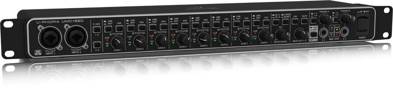 Оснащенный микрофонными предусилителями MIDAS, UMC1820 позволяет записывать вокал или акустические инструменты напрямую в звуковой редактор с впечатляющей чистотой звучания. Behringer U-PHORIA UMC1820 предусматривает фантомное питание +48 Вольт для конденсаторных микрофонов и достаточное усиление для динамических. Кроме того, цифровые конвертеры с высоким разрешением 24 бит/96 кГц гарантируют, что сигнал, приходящий на интерфейс будет передан с точностью до мелочей.
