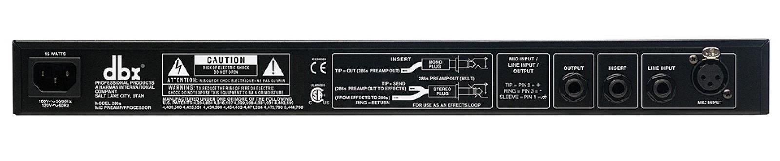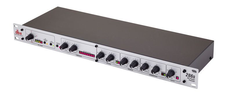 dbx 286S - одноканальный микрофонный предусилитель с пятью динамическими процессорами, в число которых входят компрессор, де-эссер с регулируемой частотой, энхансер низких и высоких частот, а также экспандер/гейт. Имеется сбалансированный микрофонный вход на разъеме XLR и линейный (phono jack) входы, обрезной фильтр ВЧ на входе (частота среза 80 Гц), фантомное питание 48 В, разрыв для подключения внешней обработки, светодиодные индикаторы входного уровня, глубины компрессии (gain reduction) и перегрузки. Симметричные входы и выходы, встроенный блок питания, дискретные регуляторы.