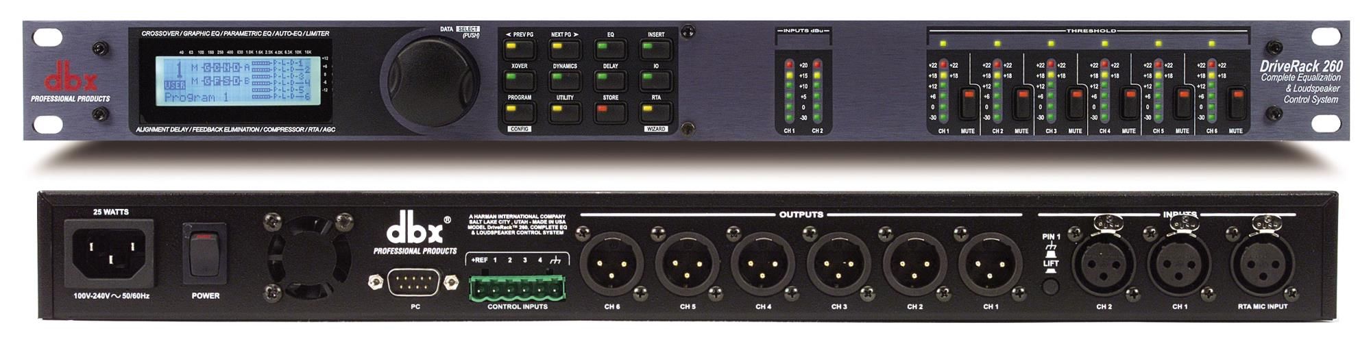 DriveRack 260 продолжает традиции серии DriveRack, которая была создана компанией, переопределившей стандарты в области обработки сигнала, и устанавливавшей новые на протяжении более чем 30-ти последних лет. DriveRack 260 была спроектирована с намерением и замыслом предложить ультрасовременную обработку сигнала и при этом сохранить простой и интуитивный пользовательский интерфейс. Цель была достигнута предложением двух независимых каналов обработочной мощности с пригодным для совмещения 28-миполосным графическим эквалайзером, модулем стерео компрессора dbx, ставшим индустриальным стандартом, подавителем обратной связи и 120A Subharmonic Synthesizer на входе, с шестиканальной выходной системой, которая включает параметрические эквалайзеры и лимитеры PeakStopPlus (для предотвращения повреждения акустических систем). Эти свойства, совмещенные с мастером процесса установки и полным управлением DriveWare GUI, представляют упорядоченный дизайн, гарантирующий оптимальную, всеобъемлющую обработку в полностью расширяемой системе.