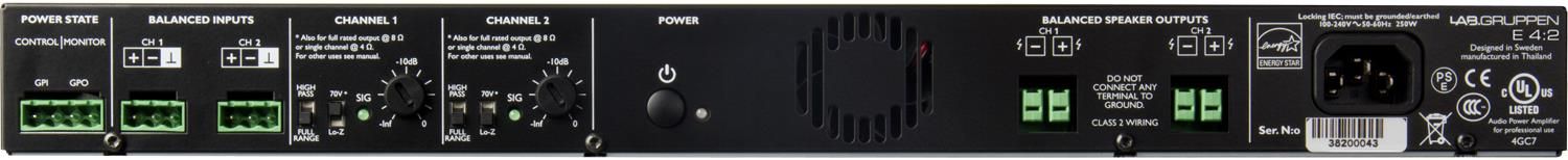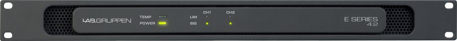 Lab.gruppen E4:2 – это компактный инсталляционный двухканальный усилитель мощности класса D, входящий в серию E производителя Lab.gruppen, предназначенный для применения в постоянных инсталляциях (барах, ресторанах, моллах, отелях, церквях и т.д.), рэковое размещение, высота 1U. Усилитель допускает подключение низкоомной нагрузки сопротивлением 2, 4, 8 или 16 Ом, выдавая от 50 до 400 Ватт на оба канала во всех режимах, также есть возможность установки в трансляционную линию 70/100В с асимметричной нагрузкой: можно комбинировать высокоомные и низкоомные режимы в различных конфигурациях, которые перечислены в комплектной инструкции пользователя. Установка уровня звука производится с помощью двух ручек на тыловой панели, отдельных для каждого из каналов.