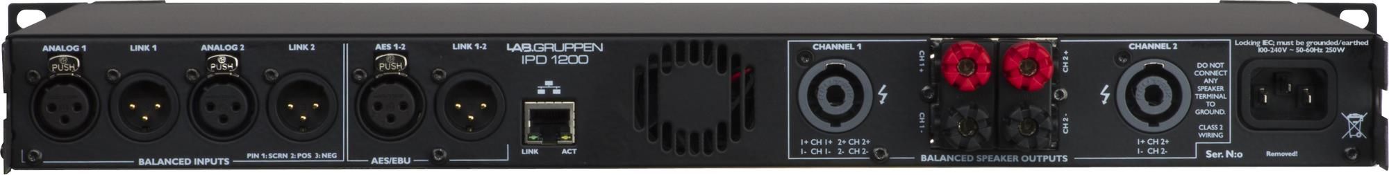Lab.gruppen IPD1200 несет в себе массу и других инноваций. Это включает в себя технологию IDEEA (IntelliDrive Energy Efficient Amplifier), которая позволяет усилителю иметь очень высокую выходную мощность с очень низким уровнем искажений при минимальном потреблении тока, а также оптимизировать низко- и высокомпедансные выходы. Также на борту есть и цифровые входы AES3, выполненные на XLR, с их помощью усилитель может подключаться напрямую к цифровой микшерной консоли. Эти входы могут быть установлены для автоматического перевода в аналоговый режим в случае внезапной аварии.