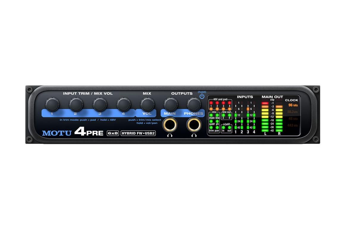 MOTU 4pre это гибридное устройство (аудио-интерфейс + микшер), который имеет четыре микрофонных входа с предусилителями с фантомным питанием 48 В. Микширование может быть осуществлено с помощью прилагаемого программного обеспечения CueMix на подключенном компьютере. MOTU 4pre подключается через FireWire или высокоскоростной USB 2.0 для компьютера (Mac или PC) и обеспечивает профессиональное качество звука, микширование, а также множество входов и выходов, включая четыре микрофонных входа с предусилителями, альтернативный гитарный/линейный входы, четыре канала аналогового выхода, стерео S/PDIF и два стерео выхода на наушники. Интерфейс также предлагает аналоговое управление, DDS (прямой цифровой синтез) аудио синхронизацию и инструментальный тюнер.