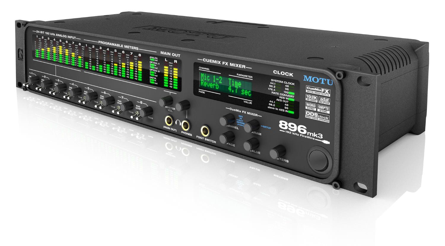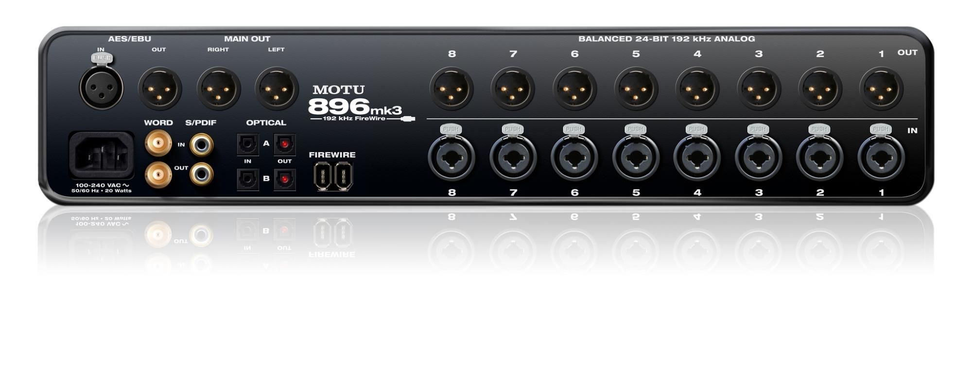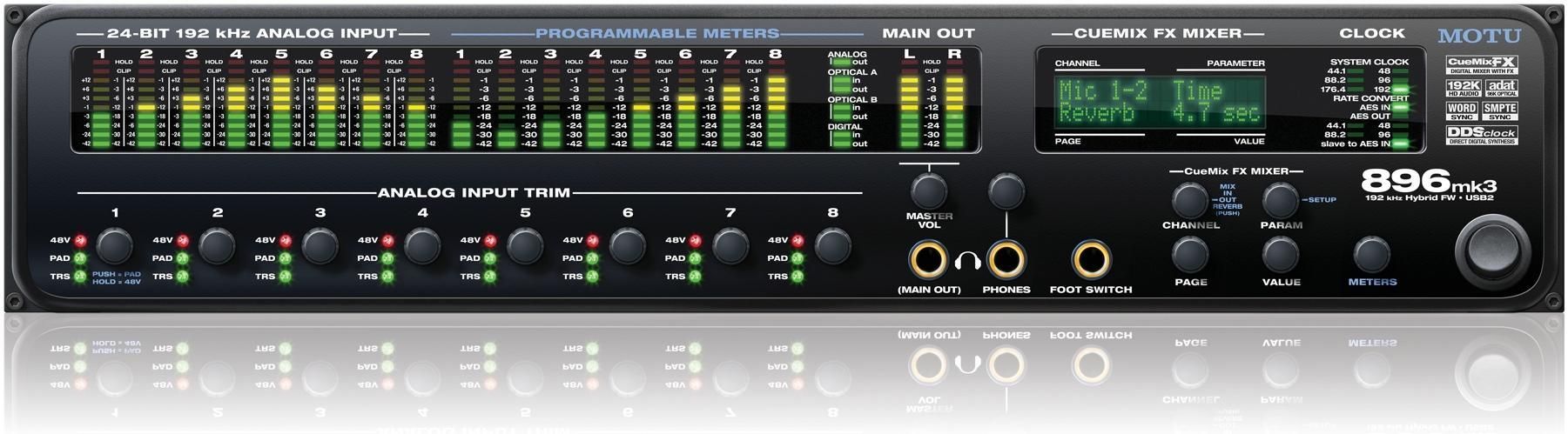 MOTU 896mk3 Hybrid есть что предложить: 8 XLR/TRS "комбо" аналоговые входы с предусилителями, 10 XLR аналоговых выходов, в общей сложности 28 входов и 32 выхода, 192 кГц аналоговых действий, сигнал защиты от перегрузки, 32-бит с плавающей точкой DSP для цифрового микширования и эффектов обработки, 2 банки с настраиваемыми оптическим входом / выходом, а также поддержка синхронизации временного кода.