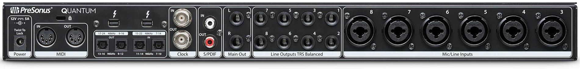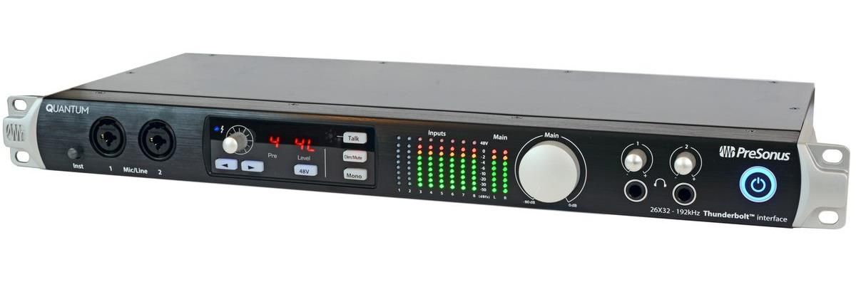 Presonus Quantum обеспечивает высокое качество звука за счёт использования передовых 24-битных конвертеров с динамическим диапазоном в 120 дБ и микрофонных предусилителей XMAX™. В числе прочих достоинств данного интерфейса можно отметить чрезвычайно низкую задержку, тесную интеграцию с прилагаемым программным обеспечением Studio One® Artist, возможность удалённого управления микрофонными преампами (для этого используется ПО UC Surface или iPad-приложение Studio One Remote), наличие встроенного Talkback-микрофона и отдельных элементов управления функциями мониторинга (Dim, Mute и Mono).