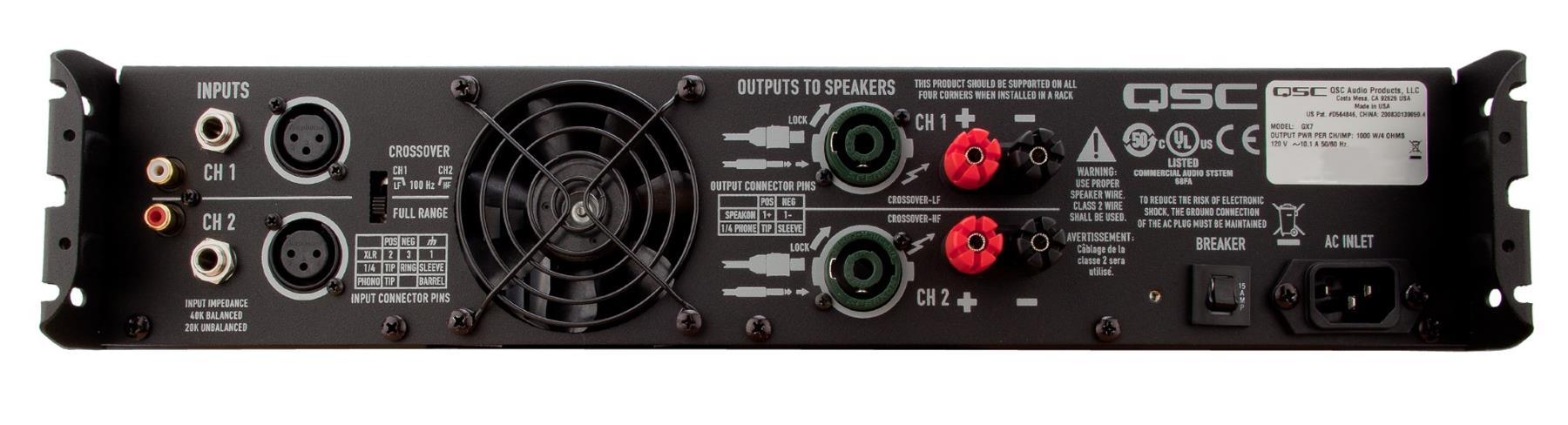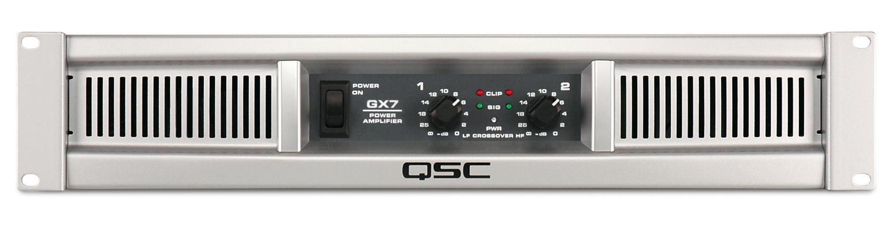QSC GX7 – это профессиональный усилитель мощности класса H серии GX от компании QSC. Он обеспечивает нужную мощность для наиболее популярных АС, используемых в увеселительных местах, в том числе и на открытых площадках. Как правило, рекомендуется использовать усилитель с необходимой программной выходной мощностью или удвоенной номинальной RMS. Данный усилитель также оборудован технологией PowerLight в выходной секции для предоставления большего питания и экономии веса: усилитель весит 7,5 килограмм. Еще одна отличительная особенность QSC GX7 – стереофонический вход RCA с фонокорректором вдобавок ко входам на 1/4" TRS Jack и XLR.
