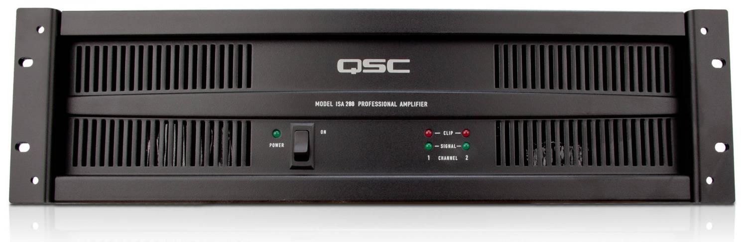 Коммерческий двухканальный рэковый усилитель мощности QSC ISA280 принадлежит к классу AB и обладает высотой 3U. Он используется с профессиональными громкоговорителями в озвучивании больших помещений, а также в постоянных и временных инсталляциях. У него три схемы работы (моно, стерео и мост), а полная выходная мощность варьируется в зависимости от подключенной нагрузки: к примеру, это 185 Вт/канал при подключении акустики сопротивлением 8 Ом, также можно подключать восьмиомные и двухомные АС. Работу контролирует система встроенных отключаемых лимитеров.