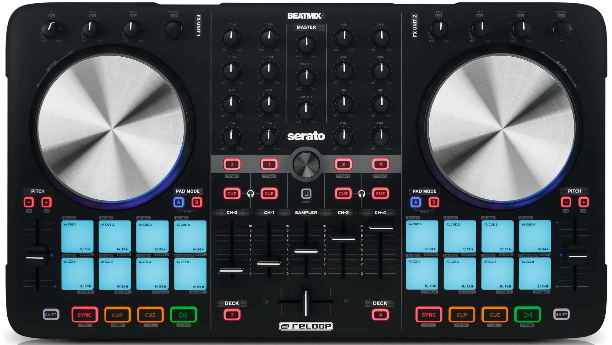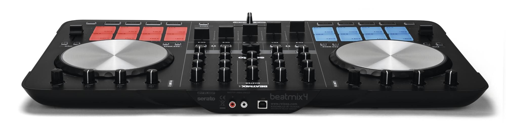 Reloop Beatmix 4 MK2 - это 4-дековый контроллер, предназначающийся для использования сдиджейским ПО типа Serato DJ. Следует отметить, что эта версия была изготовлена в корпусе целиком в чёрном цвете (как впрочем и в ситуации с предыдущей моделью типа Beatmix 2 MK2).