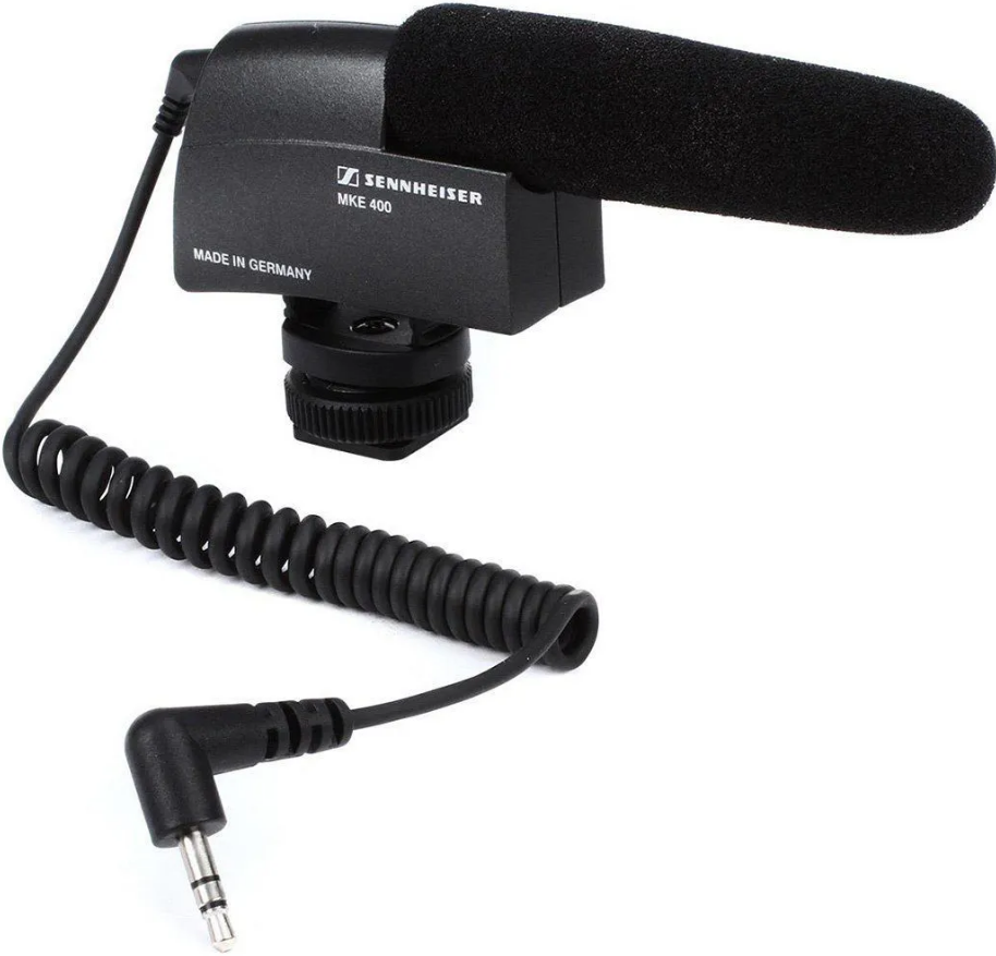 Sennheiser MKE 400 – компактный накамерный микрофон-пушка с башмаком для подсветки и внешним микрофонным входом. У него суперкардиоидная характеристика направленности. Микрофон отличается максимальным подавлением стороннего шума, оптимизацией для записи видео и прочным цельнометаллическим корпусом. У него есть переключаемый фильтр от шума ветра. Микрофон работает от одной батареи ААА в течение около 300 часов, о ее состоянии свидетельствует бортовой светодиод. Интегрированный антишоковый подвес защищает от шума корпуса. В комплекте поставляется ветрозащита.