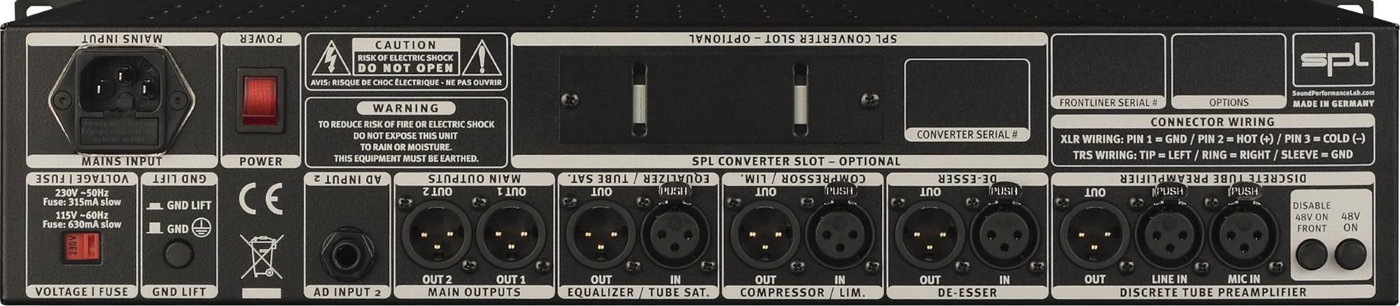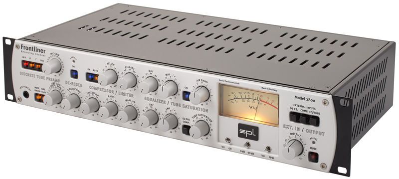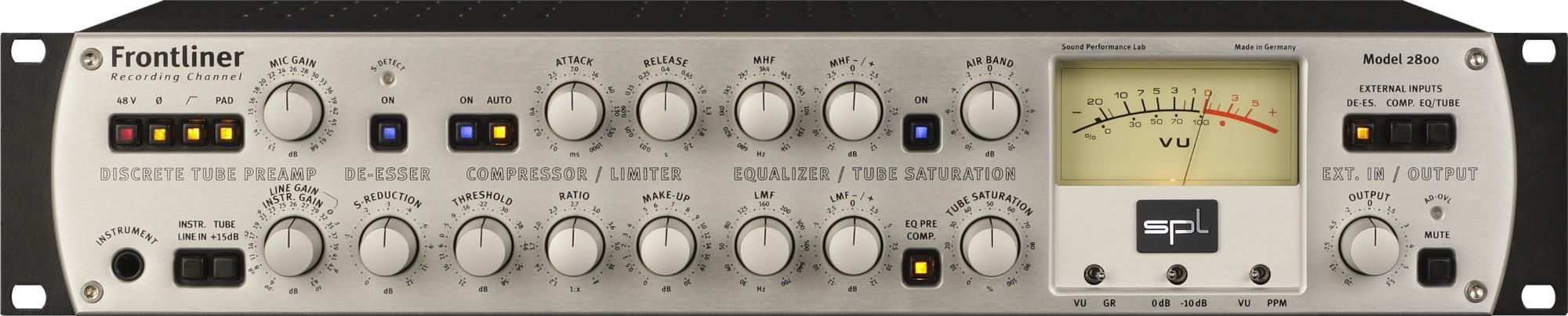 SPL 2800 Frontliner - Одноканальный ламповый процессор: дискретный класс А предусилитель, деэссор, компрессор/лимиттер, эквалайзер, ламповое насыщение, индикатор уровня, балансные входы/выходы.