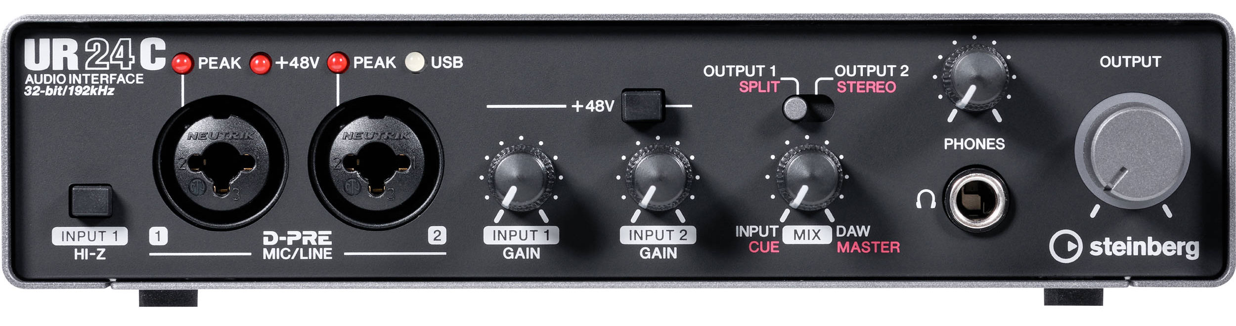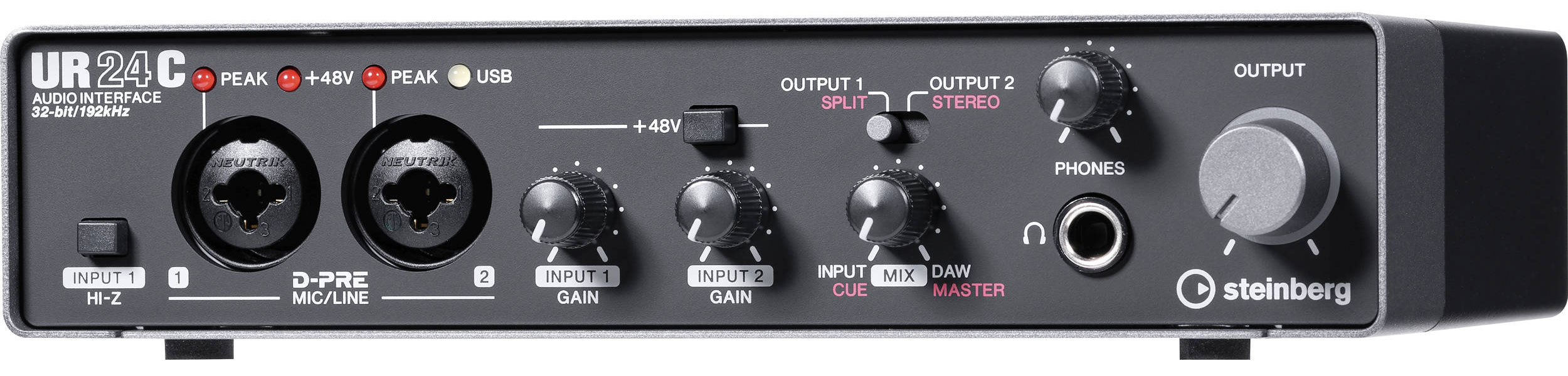 Steinberg UR-24C – внешний USB-аудиоинтерфейс для живых выступлений и небольших домашних студий. Работает на шине USB 3.1 и подключается к компьютеру с помощью разъема USB Type C. Карта работает с частотой дискретизации 32 бит/192 кГц, оборудована MIDI-разъемами и DSP-чипом для обработки сигнала эффектами в реальном времени во время мониторинга. К аудиоинтерфейсу можно подключить MIDI-устройства с помощью двух разъемов на задней панели. Встеронный DSP-чип позволяет частично разгрузить компьютер и обрабатывать мониторный сигнал эффектами без задержки.