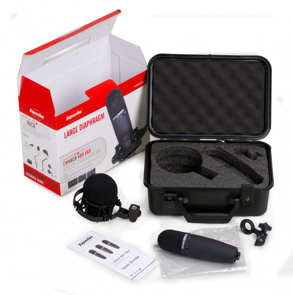 Superlux CM-H8AH — это кардиоидный конденсаторный микрофон студийного качества с диафрагмой 1 дюйм. Его главными отличаями являются: стильный черный корпус, расширенная звукопередача нижних частот и дополнительное усиление верхних. Для удобства пользователя встроенный светодиодный индикатор сообщит о наличии фантомного питания.