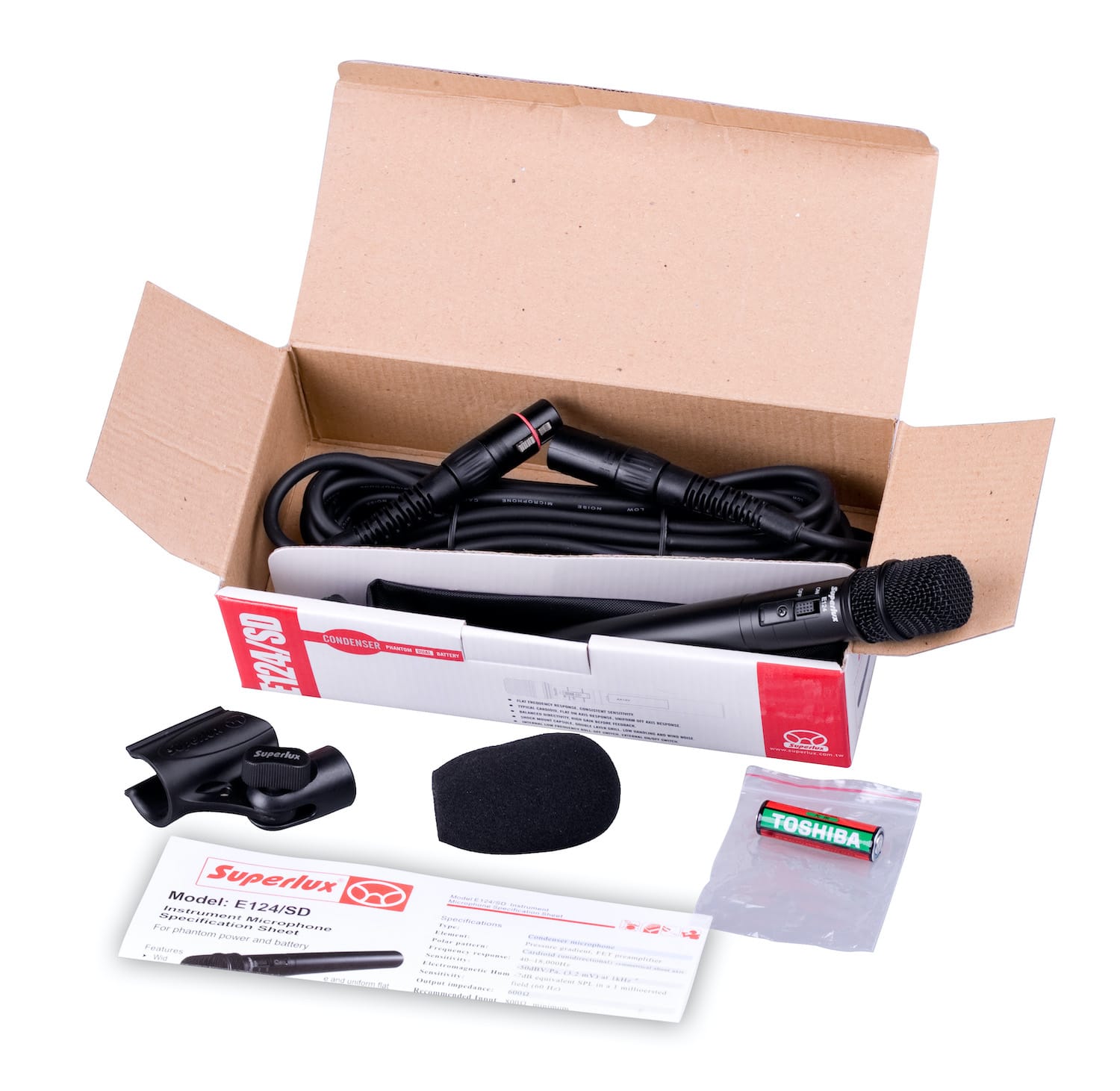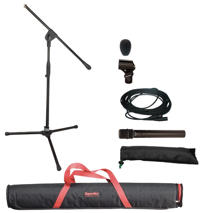 Superlux MSK124-P - это набор, в котогрый входят: микрофон E124D с чехлом, ветрозащитой и держателем, кабель XLR-джек 6 м, стойка MS128, чехол для микрофона и транспортировочная сумка.
