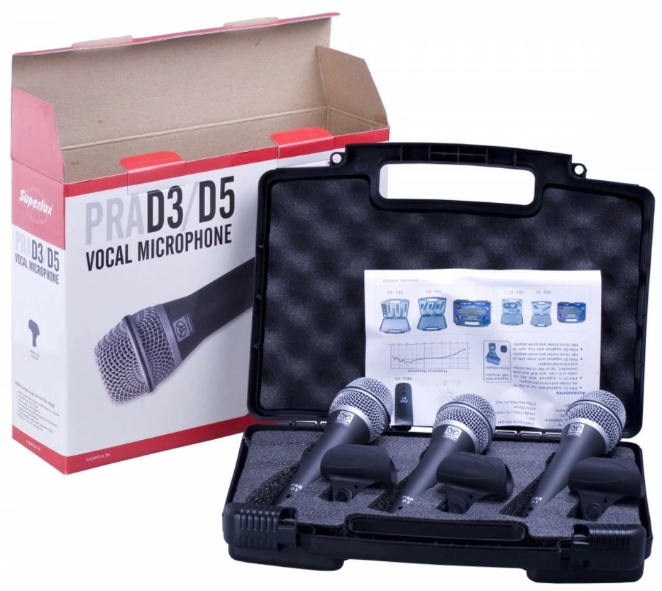 Микрофоны Superlux PRAD – это одна из наиболее популярных серий вокальных/инструментальных микрофонов суперкардиоидной диаграммой направленности. Эти динамические микрофоны обладают классической для вокала амплитудно-частотной характеристикой, а прочная конструкция с плоской металлической ветрозащитой (грилем) также делает их отличным решением для подзвучки музыкальных инструментов. Набор из 3 микрофонов в кейсе.