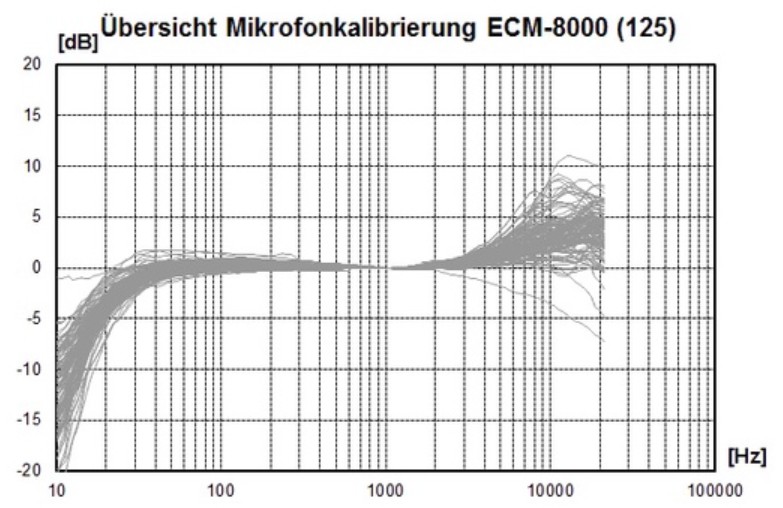 Капсюли для измерительных микрофонов M401 отбираются по предельному отклонению АЧХ +-5Дб — это не более 30% из партии, и уже само по себе неплохо. Затем каждый микрофон в сборе отдельно калибруется в диапазоне 25Гц-23кГц по прецизионному микрофону с капсюлем 4145 Brüel & Kjær, и по этой калибровке создаётся индивидуальный поверочный файл, который прилагается к микрофону. Этот файл подходит для любых измерительных программ, в том числе Smaart, REW, Arta, LSP Lab, Spectra Lab и прочих.